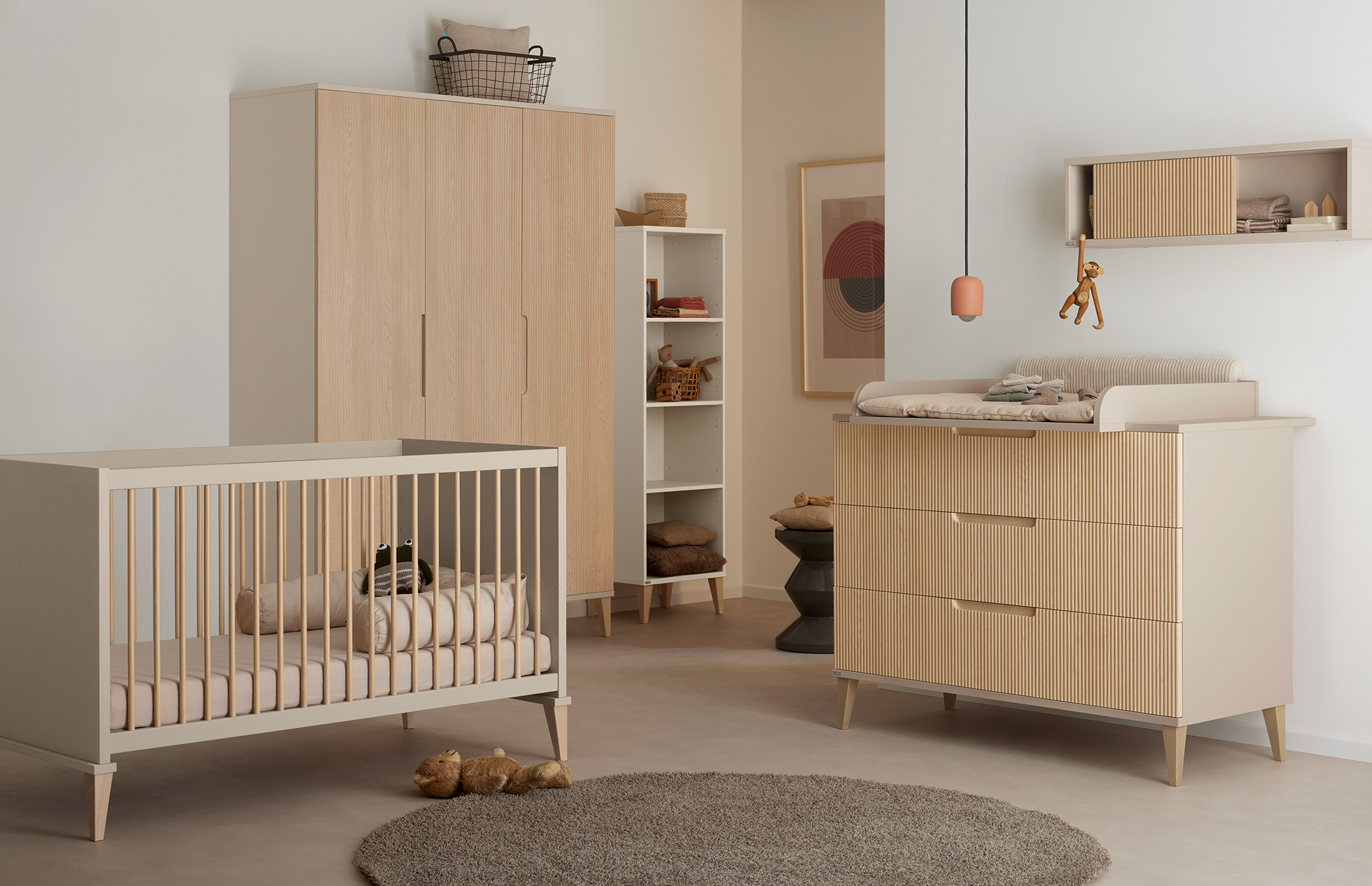 Inspiriert von der funktionalen Ästhetik Japans und der warmen Zurückhaltung Skandinaviens entsteht ein Wohngefühl, das Ruhe schenkt und deinem Kind den Raum für Kreativität, Spiele und große Träume lässt. Dreidimensionale Rillenstrukturen an den Möbeltüren und -Schubladen verleihen den Möbeln eine besondere Tiefe, während Massivholz-Akzente wie formschöne Möbelfüße Natürlichkeit spürbar machen.