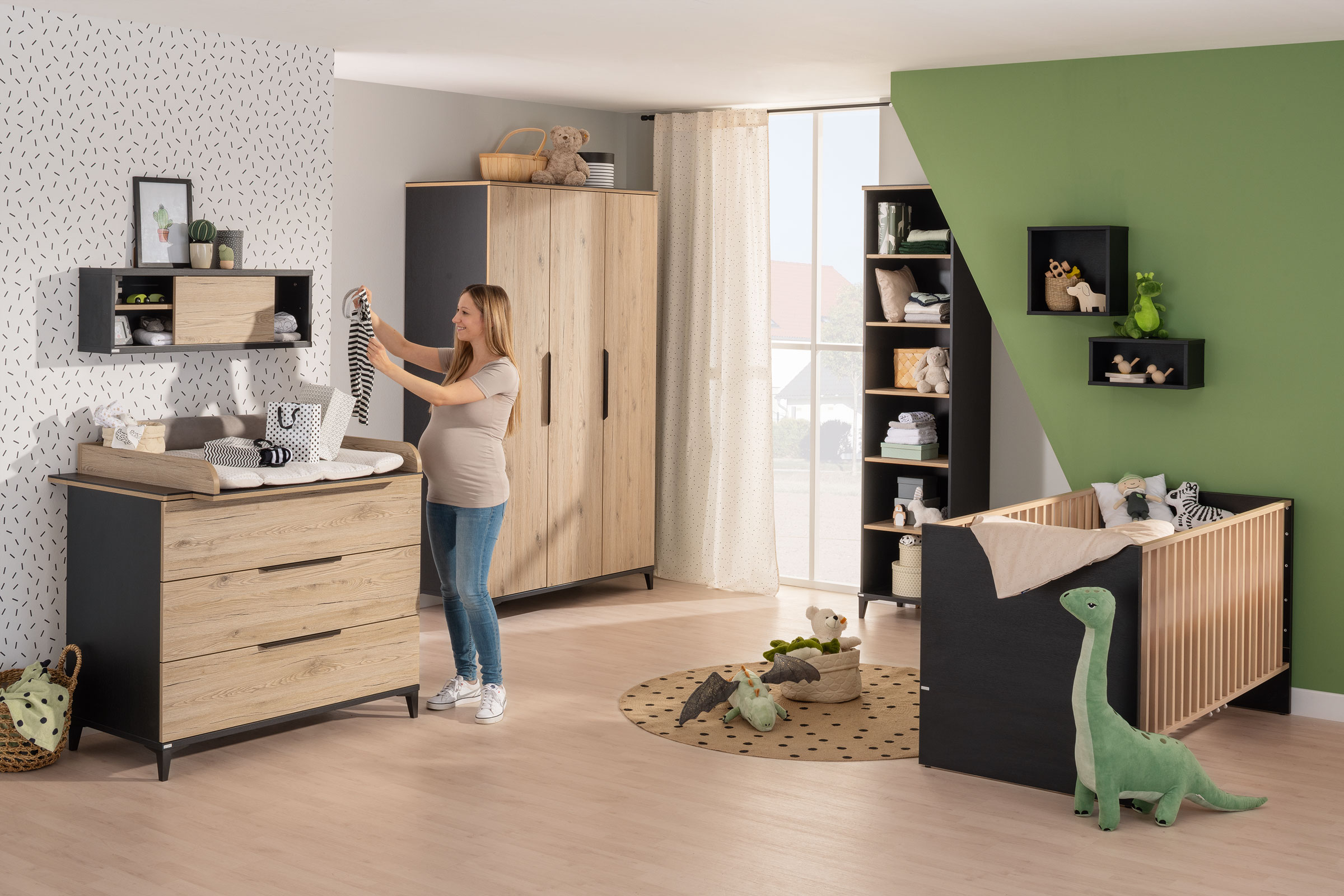 Tomke zeichnet sich durch das Zusammenspiel zweier Farbtöne aus: Schwarze Korpusse rahmen die Fronten aus warmem Holzdekor ein und verleihen den Möbeln einen urbanen Look. Die holzfarbenen Einlegeböden scheinen in den schwarzen Regalen zu schweben und setzen Schönes sowie Nützliches in Szene. So gestaltest du ein zeitloses Babyzimmer, das später auch als Grundlage für ein Kinder- oder Jugendzimmer funktioniert.