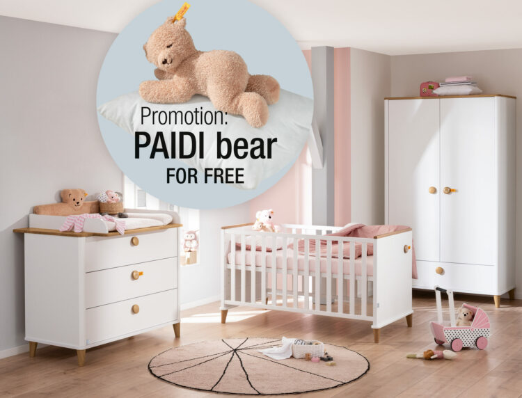 In May, you will receive a PAIDI teddy bear from Steiff worth 59 euros for freewith every Lotte & Fynn room you buy, consisting of a changing unit, baby cot and wardrobe!