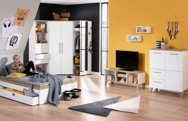 The corner wardrobe adapts perfectly to both small and large rooms and makes optimum use of every corner. Design the interior to suit your needs. Thanks to the low-hanging clothes rail, your child can choose their own clothes. Open compartments provide a complete overview and make tidying up a breeze. Depending on your child’s needs and age, the corner closet can be extended with various add-on elements on both sides – for example with an add-on shelf with open compartments or a wardrobe.
