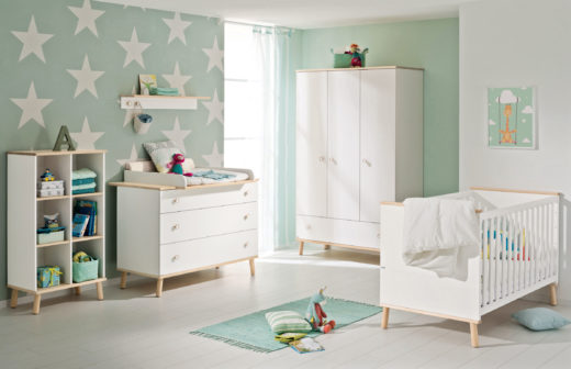 Bright and friendly baby room in a natural Scandinavian birch look.