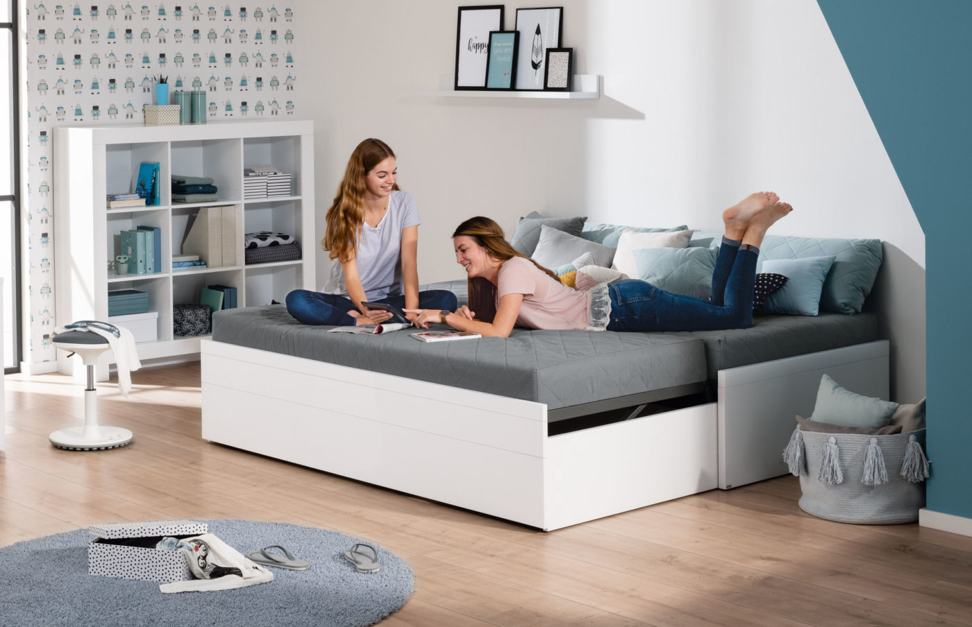 Solution flexible pour les chambres d’enfants et d’adolescents : le lit universel qui peut être non seulement un lit mais aussi un canapé et un lit double.