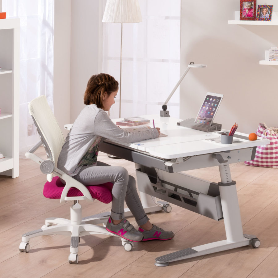 Dieser Schreibtisch für Kinder ist ein optisches und technisches Highlight. Zum weißen Gestell gibt es Tischplatten in zwei Dekors. Sie sind teilbar und lassen sich dank Gasdruckfedern beinahe schwebend in die richtige Position sowohl für Rechtshänder als auch Linkshänder bringen.