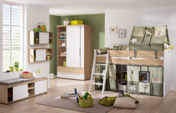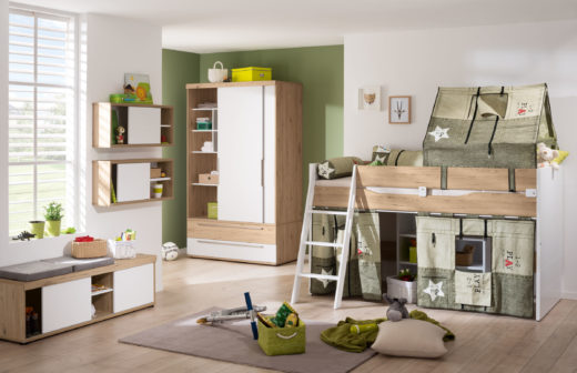 Wie alle Programme von PAIDI wachsen auch die nachhaltigen und giftfreien Kindermöbel von Fionn mit. Zu kreideweiße Flächen und Eiche-Bordeaux-Nachbildung lassen sich fürs Spielzimmer wundervoll Spitz-Zelt, Einzelvorhänge, Kissenrolle und Rückenkissen im Canvas Style oder im Jeans Style kombinieren.